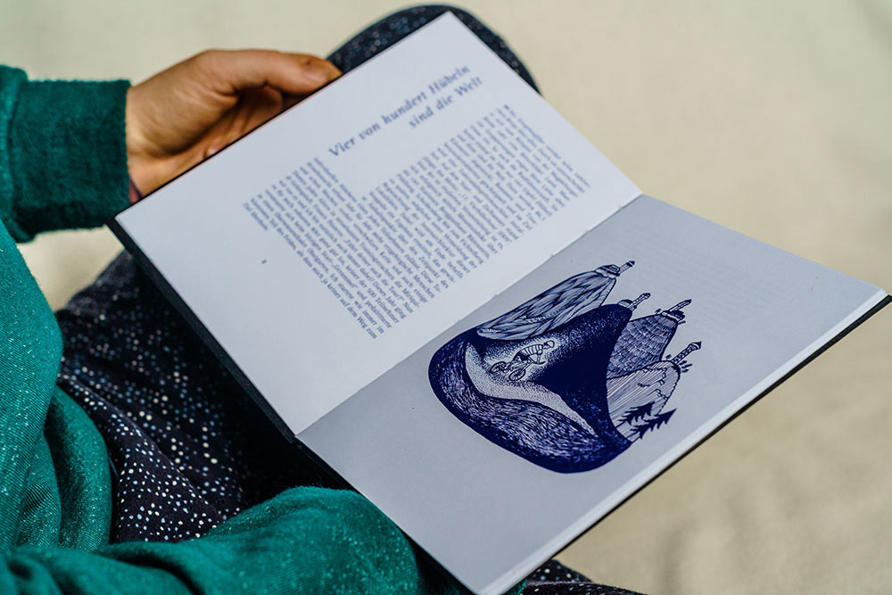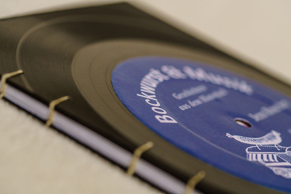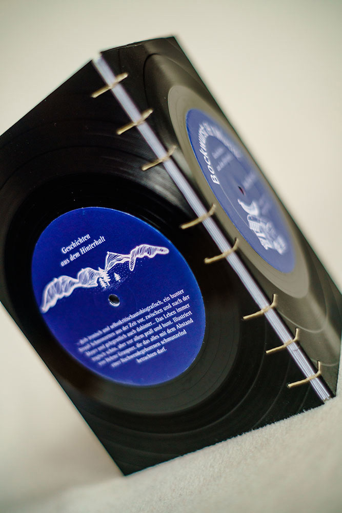 Illustration, Layout und Bindung eines Kurzgeschichten-Buches. Das Buch wurde in alte Schallplatten gebunden, somit ist jede Ausgabe ein Unikat. Die Kurzgeschichten stammen von Jens Roscher.